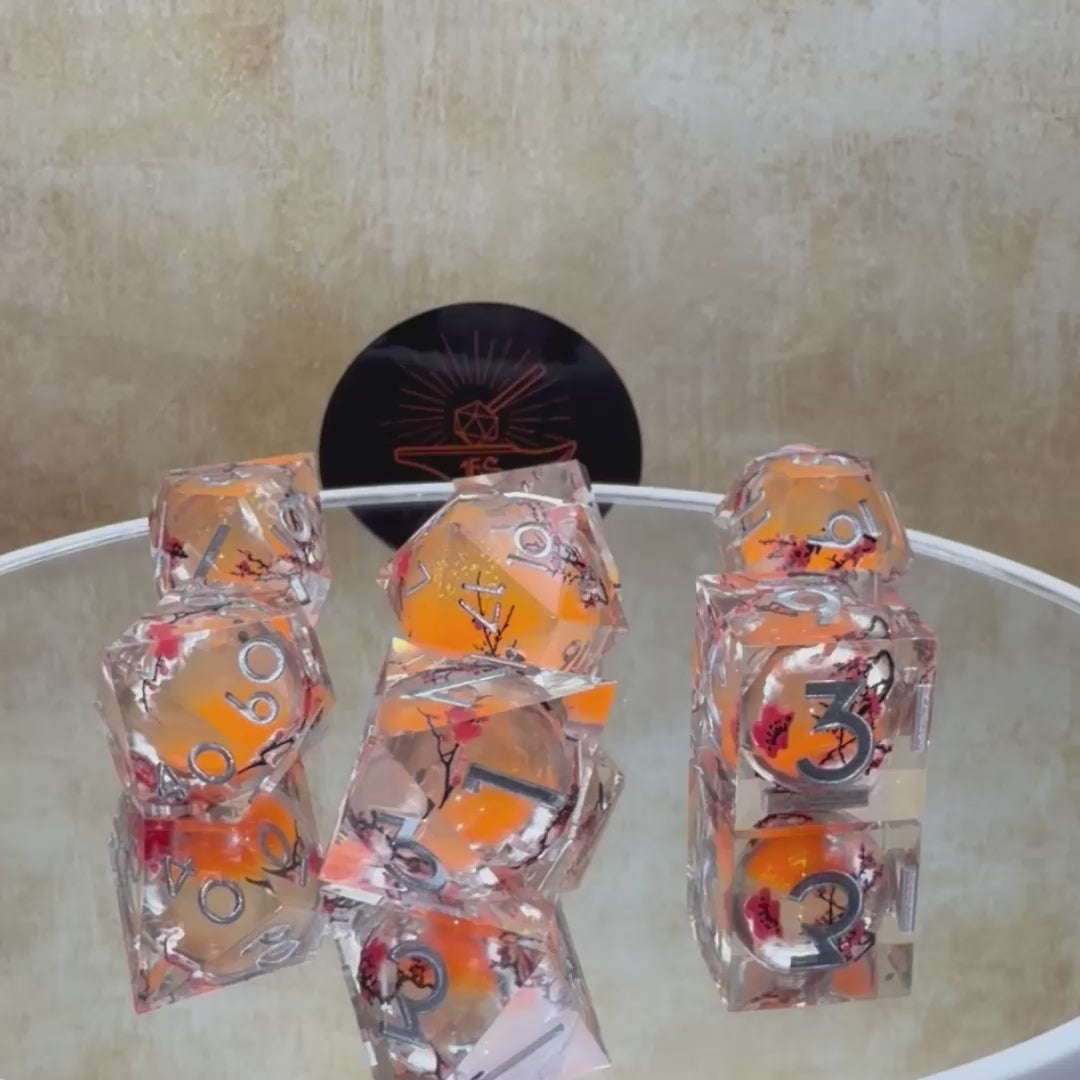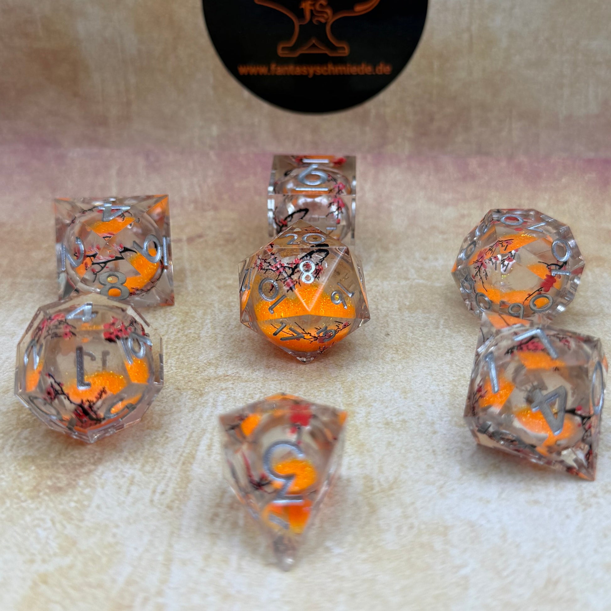 The finest orange glitter catches the light, giving each die a warm, sparkling highlight – like sunbeams on autumn petals. The liquid core creates a captivating depth effect, transforming each die into a small work of art and bringing magic to your role-playing games.