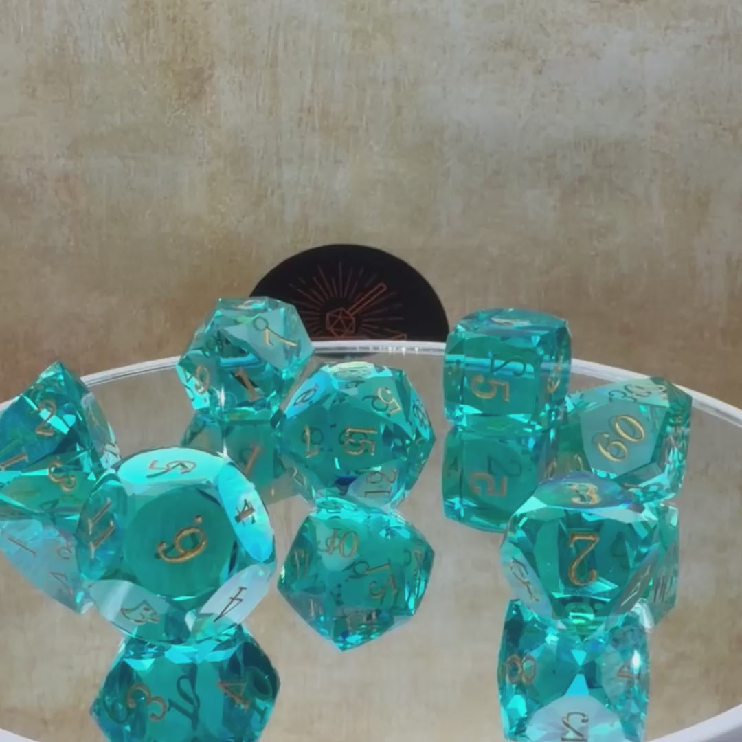 Made from high-quality resin, this set combines the elegant look of glass with the durability and balanced rolling characteristics required for role-playing games. Subtle color gradients and light reflections make each die a unique, glass-like work of art.