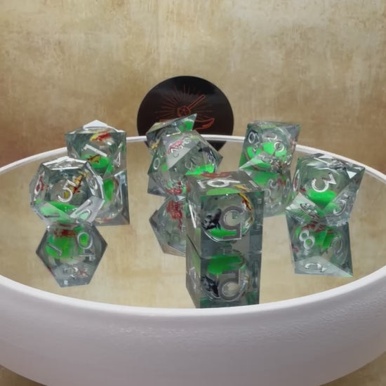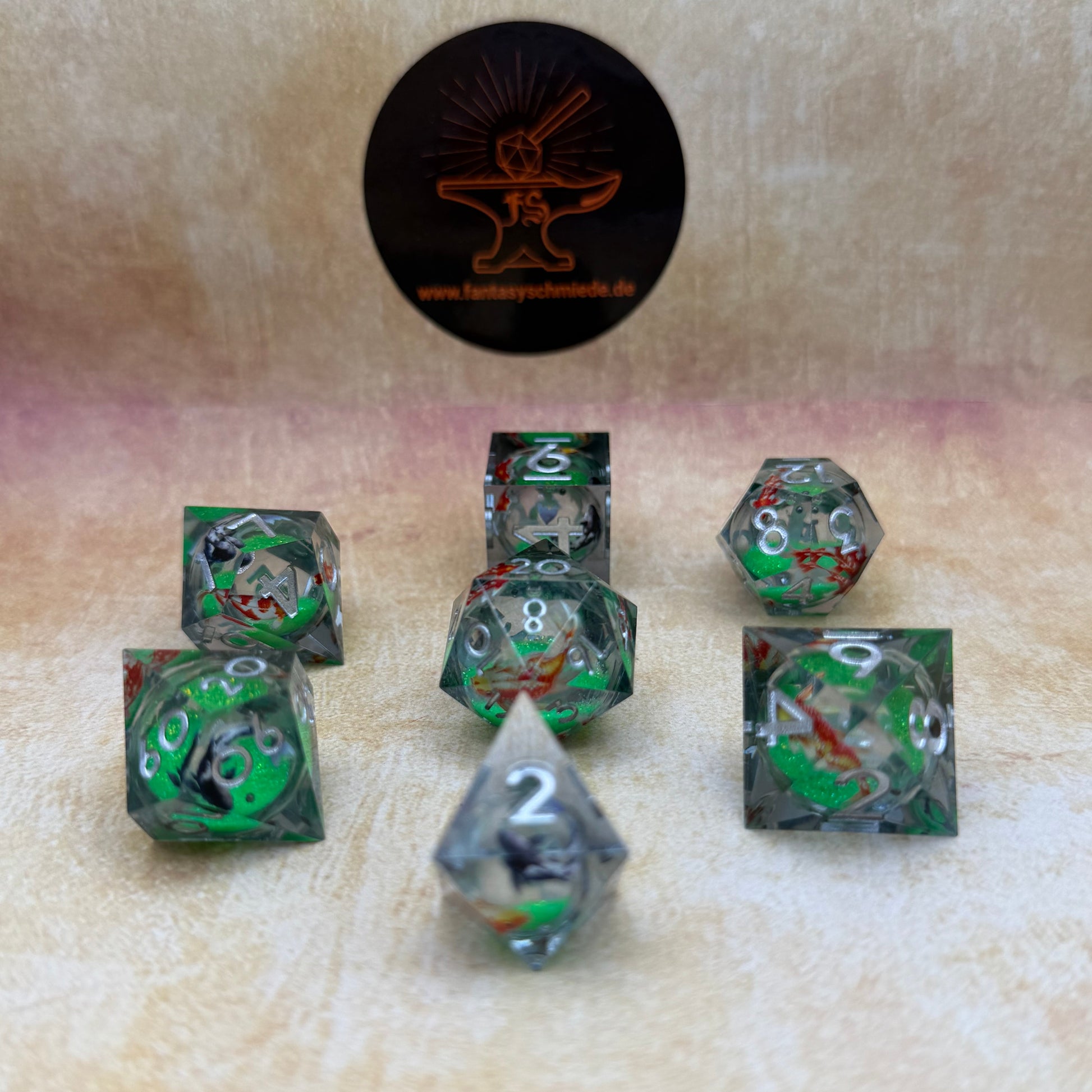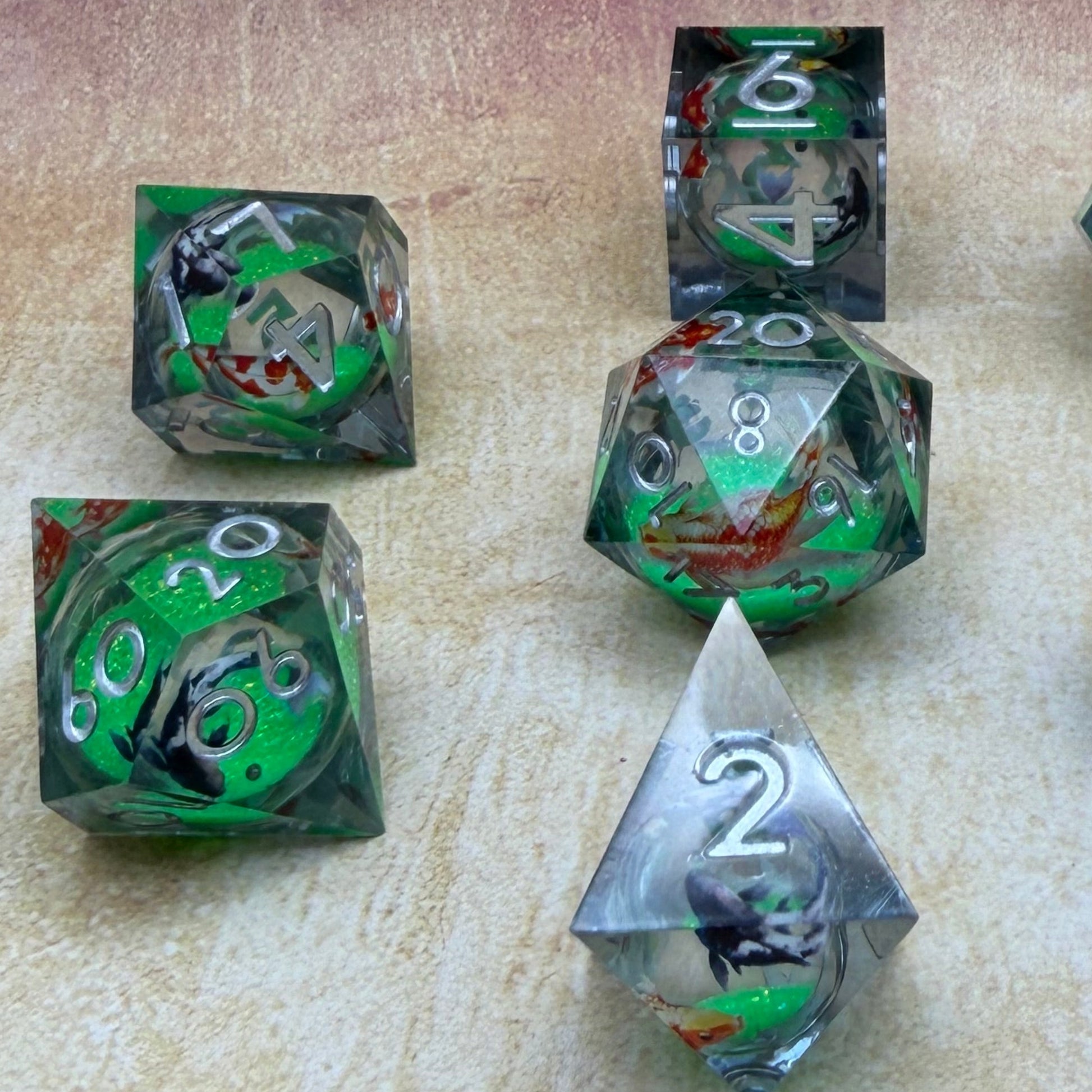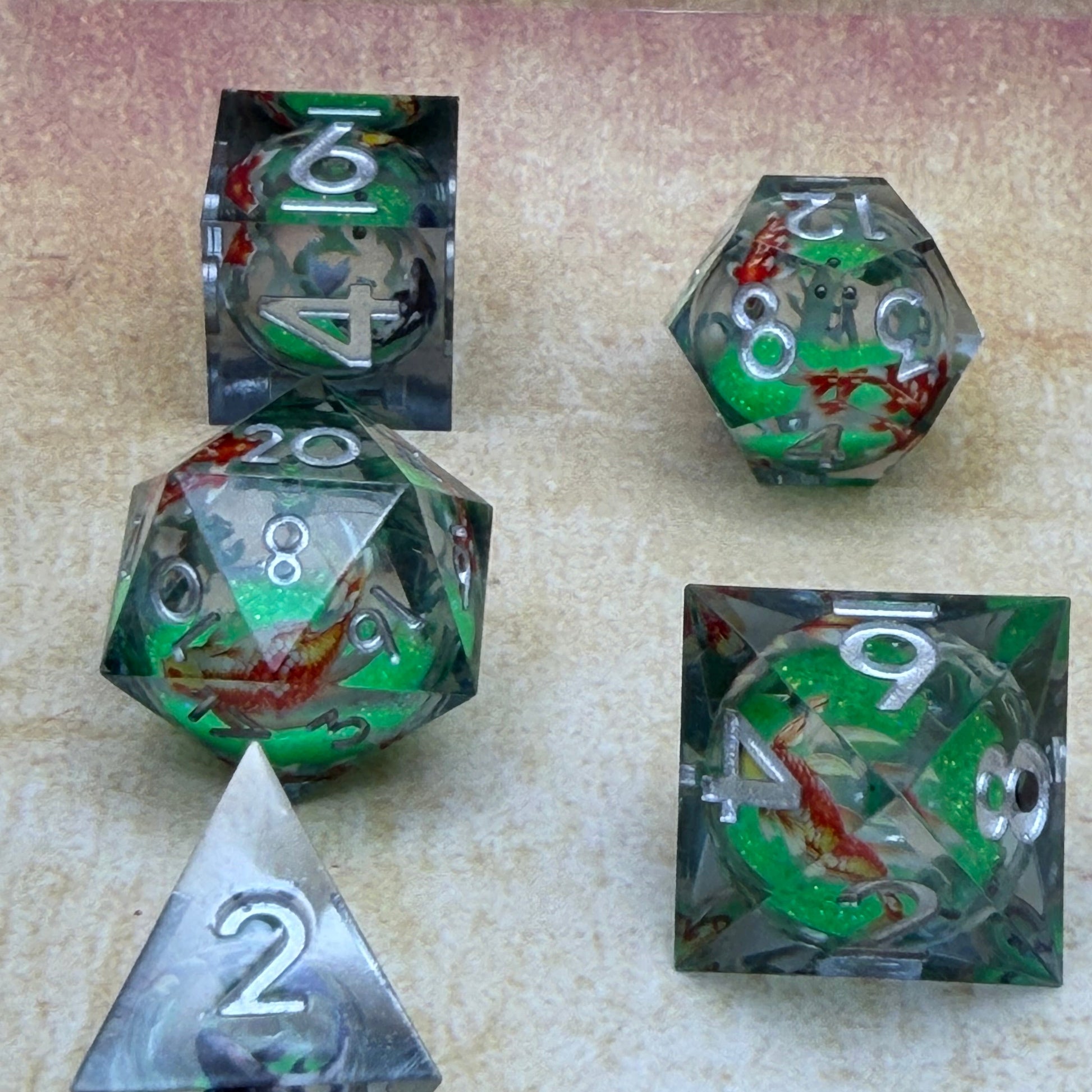 Deep in a hidden temple garden, where the water never ripples and golden koi glide through shimmering blue, lives Goldini – a mysterious guardian of ancient rules and quiet wisdom. This dice set embodies the essence of that place: clean lines, a sparkling blue like the bottom of a deep pond, and small koi swimming in the depths as if to bring you good luck.