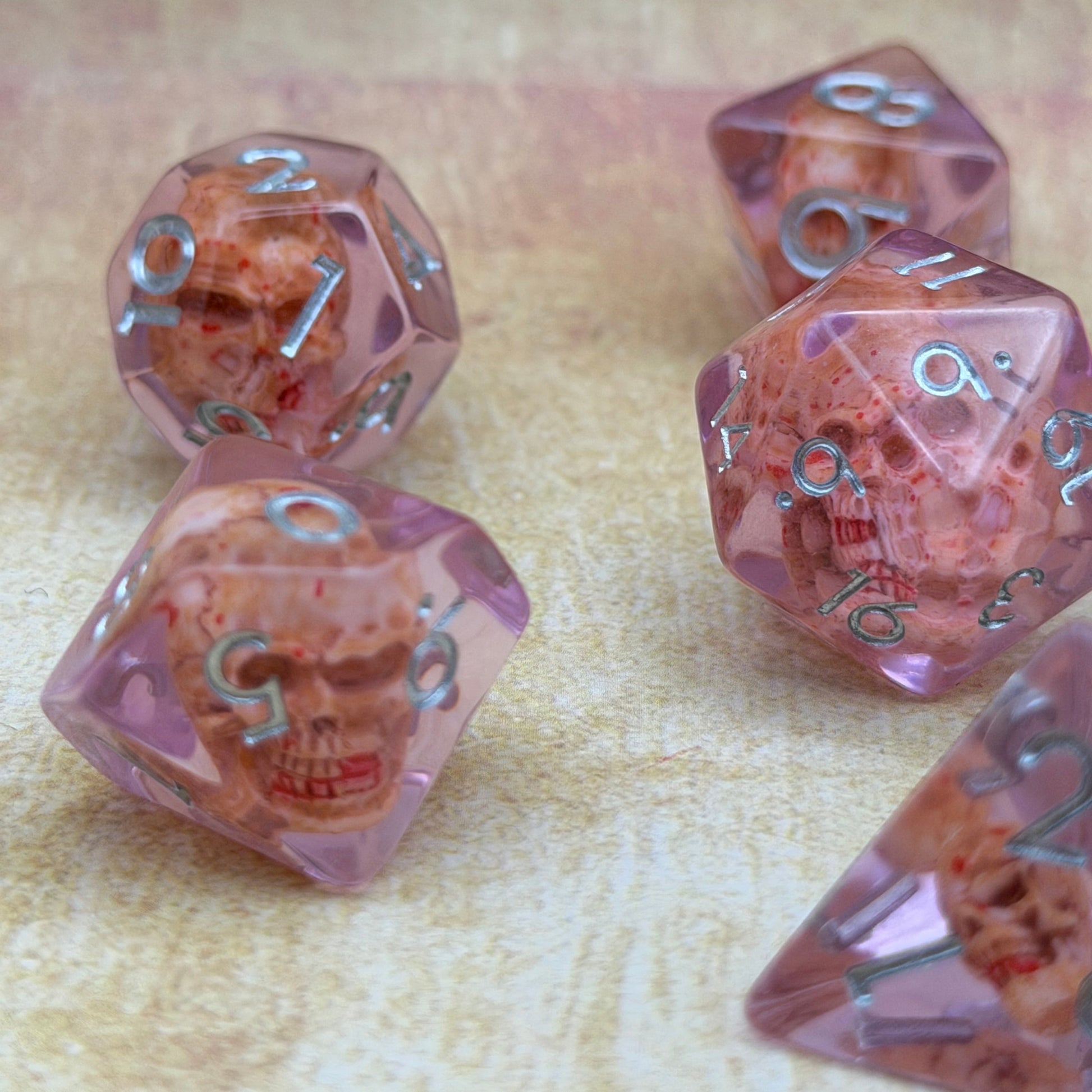 Immerse yourself in the mysterious world of Mortalis Rose . Each die contains a delicate skull inside, adorned with subtle splashes of blood – a subtle hint at the game's darker side. The dice themselves shimmer in a soft, slightly transparent rose hue , allowing the skull inside to be fascinatingly revealed with every roll.