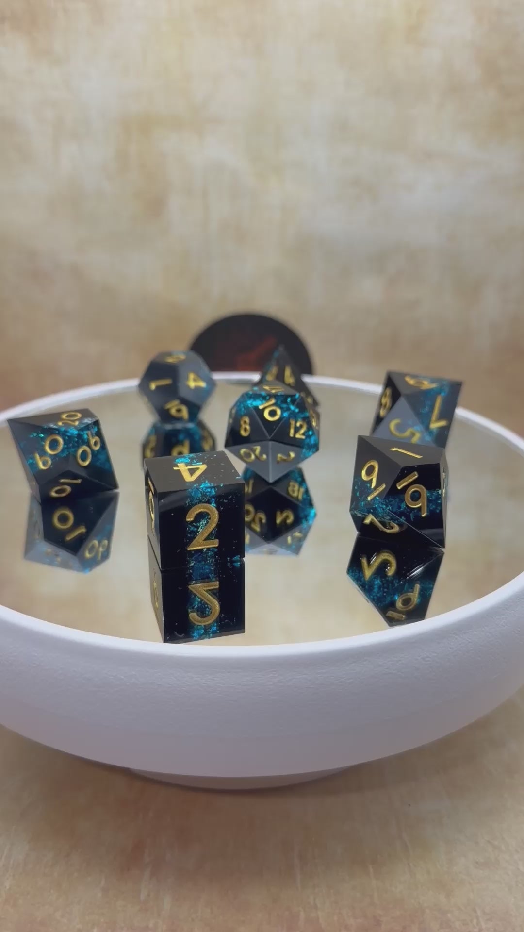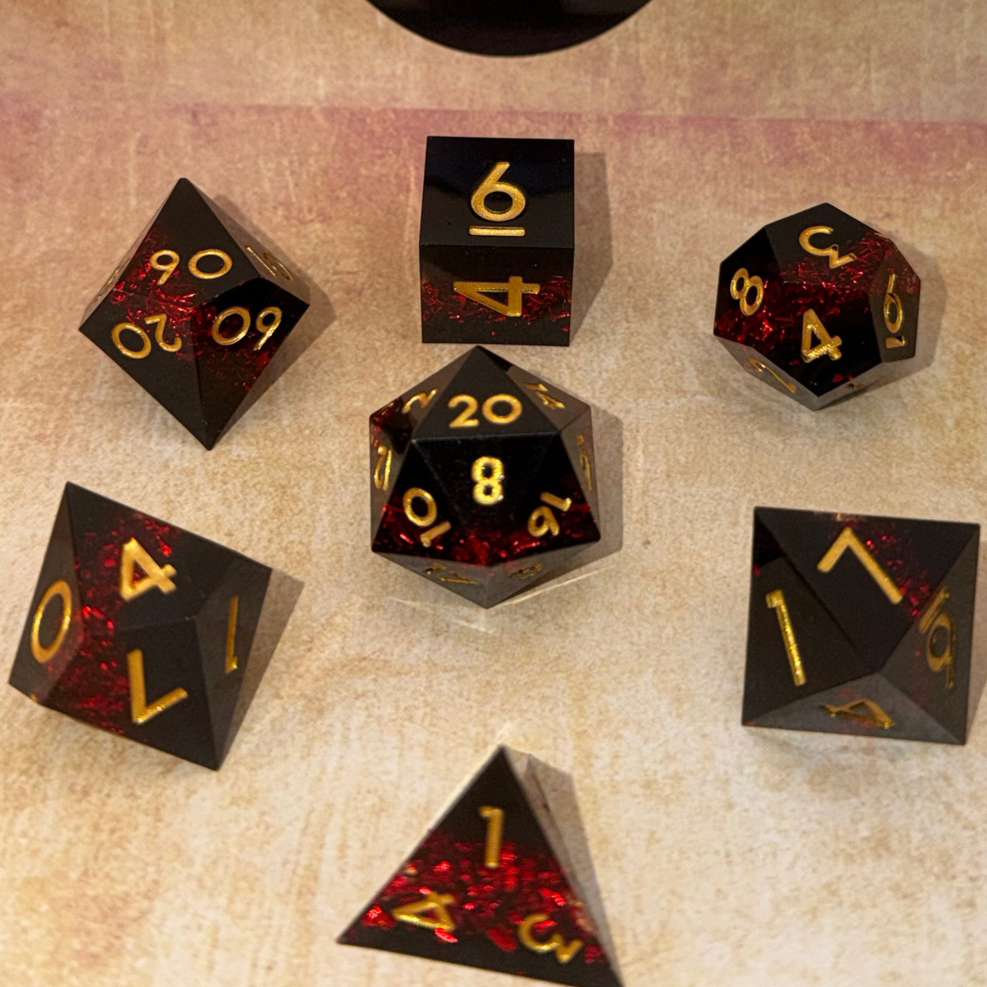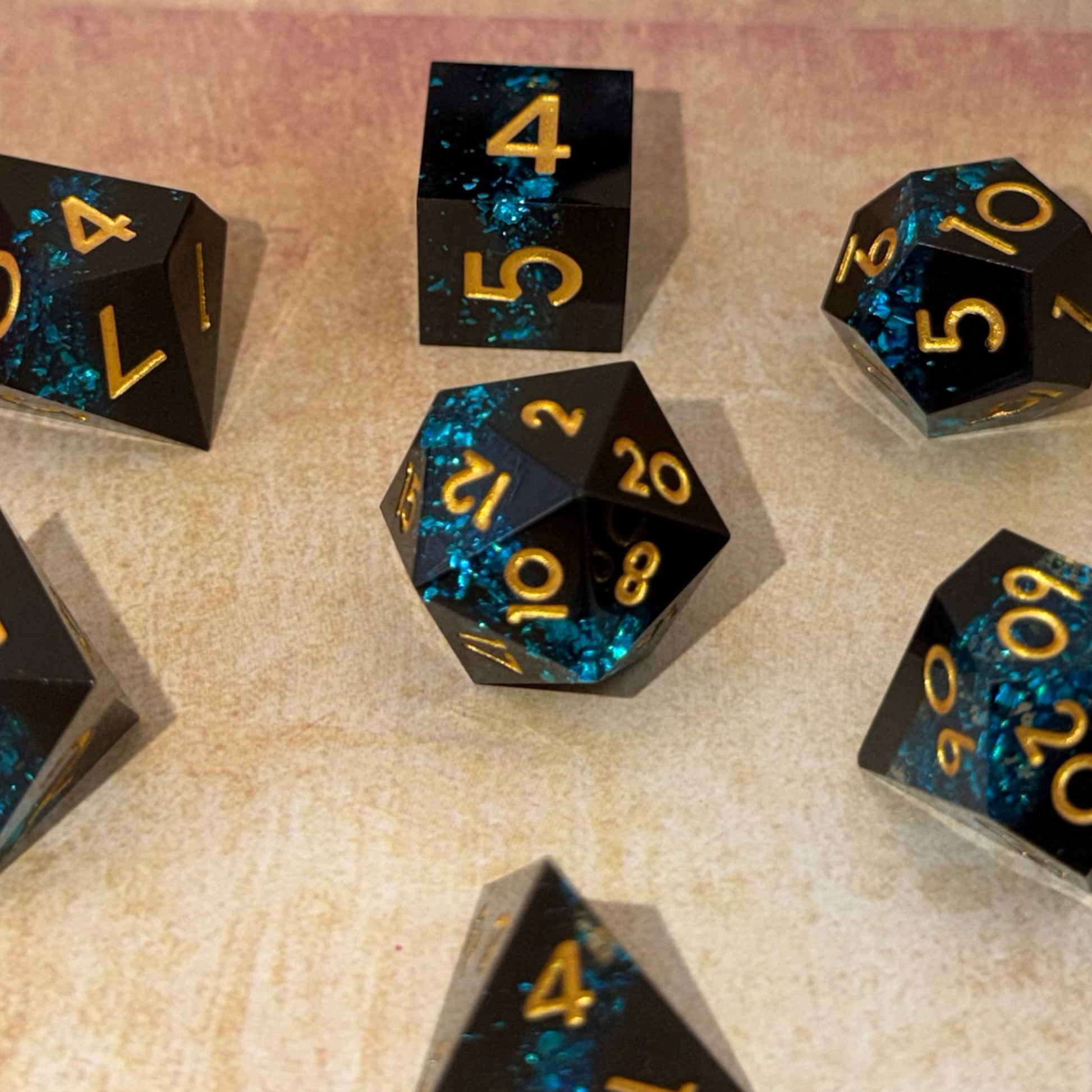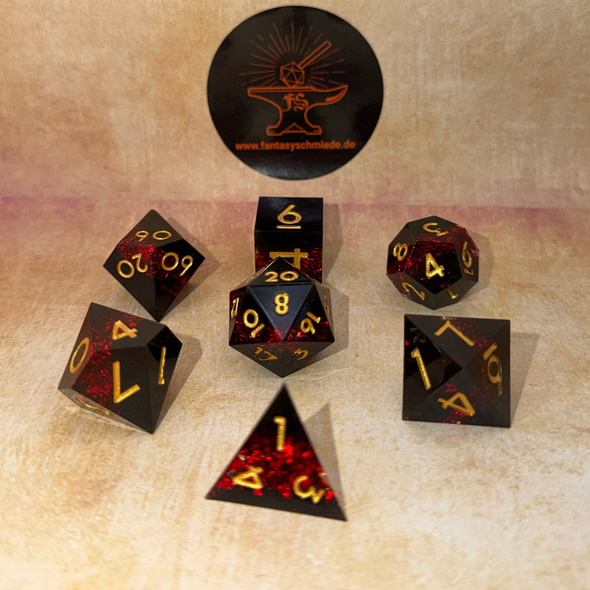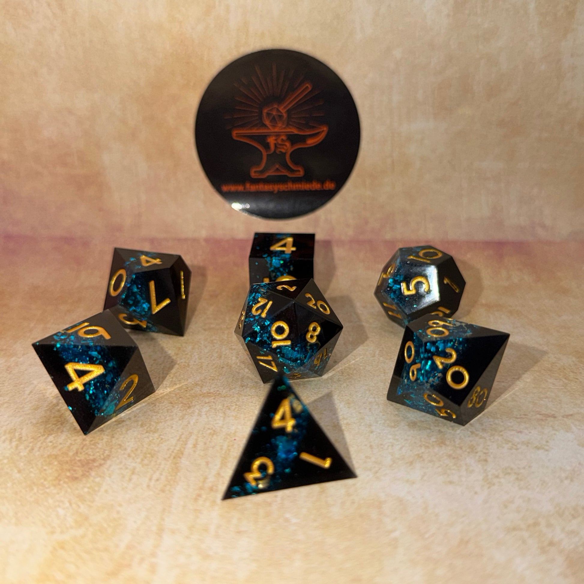 Forged from the depths of ancient mountains, this dice set carries within it the magic of forgotten times. "Enchanted Ore" combines elegant black with a shimmering vein of glitter dust – like magical particles glowing in the darkness. Each number is encased in gleaming gold, standing out powerfully against the surface.
