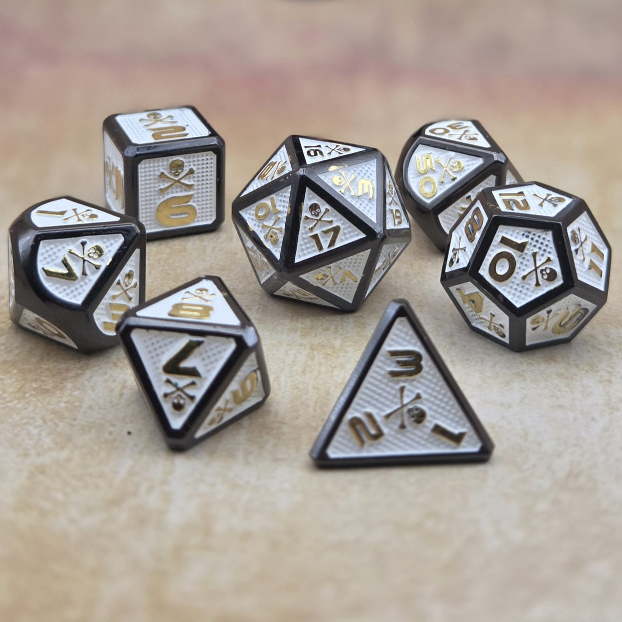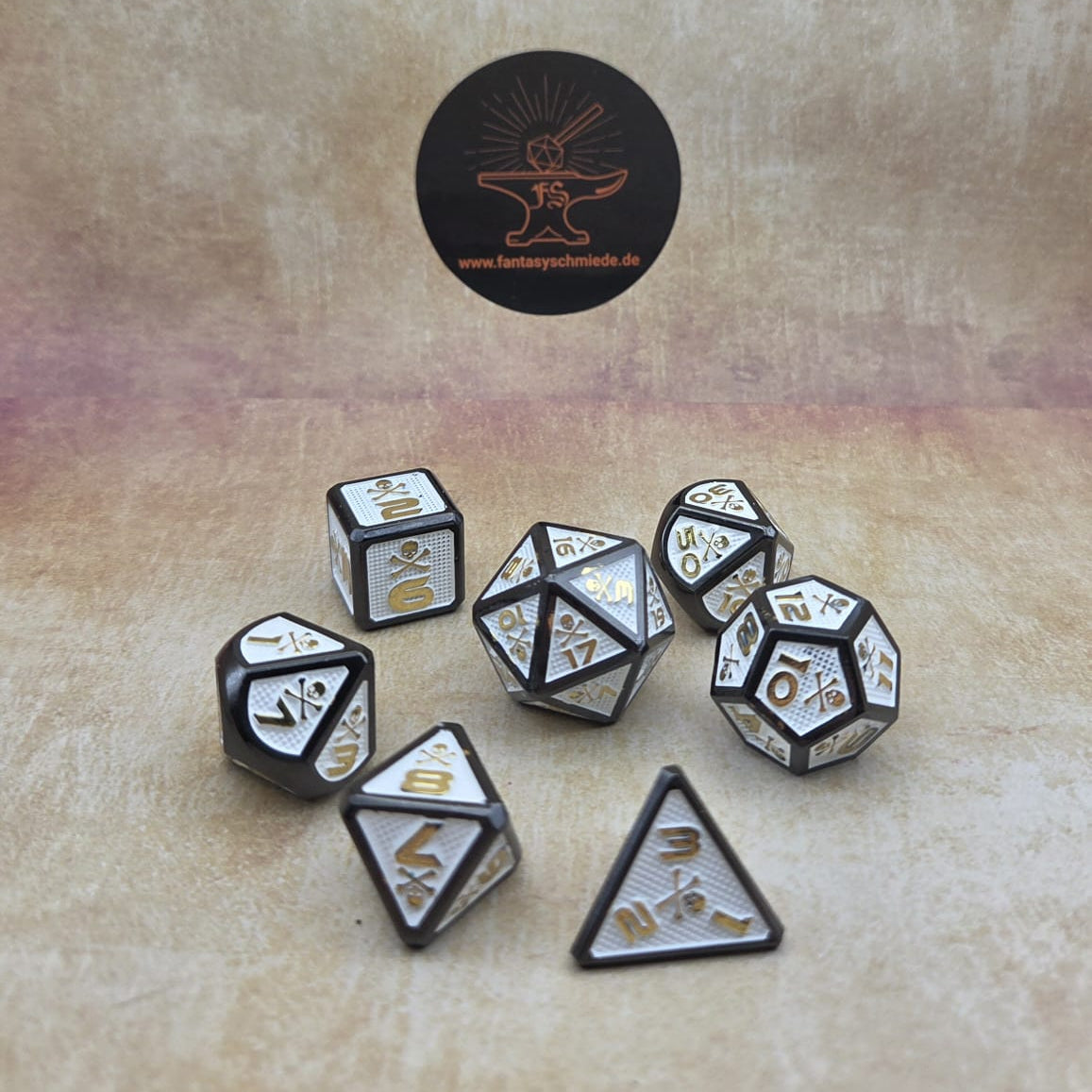 Dunkles Schwarz trifft auf strahlendes Weiß und edles Gold – wie Münzen, die im Zwielicht einer verlassenen Schatzkammer glühen. Der goldene Totenkopf auf jedem Würfel erinnert an Piraten, deren Gier nach Reichtum sie dem Fluch des Goldes überließ.