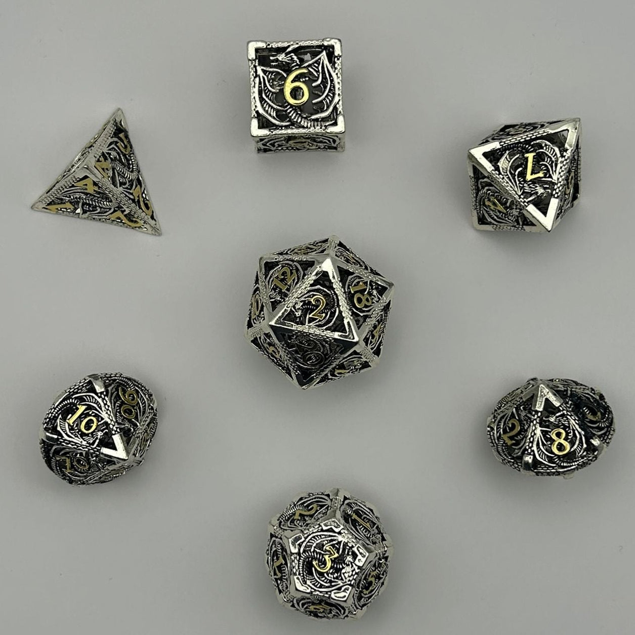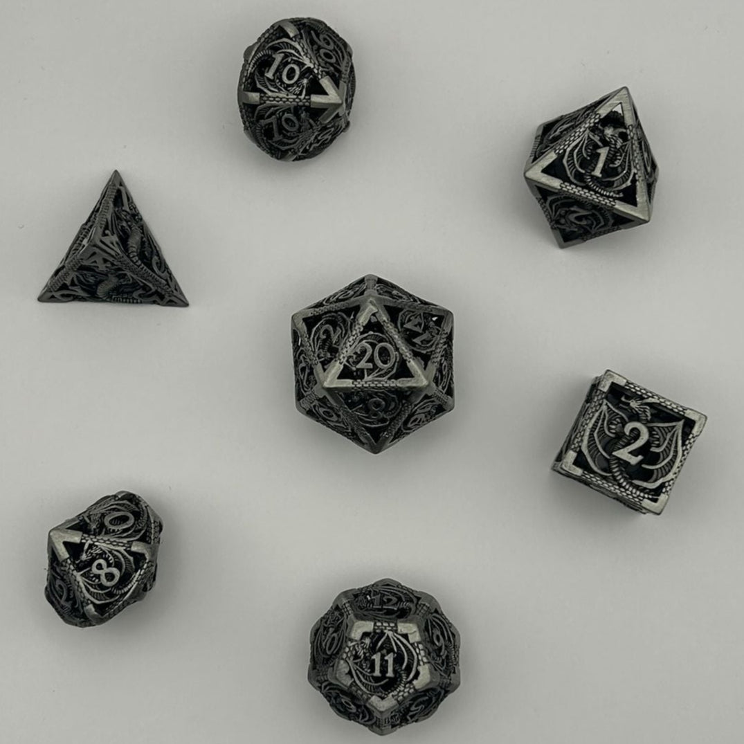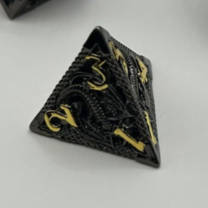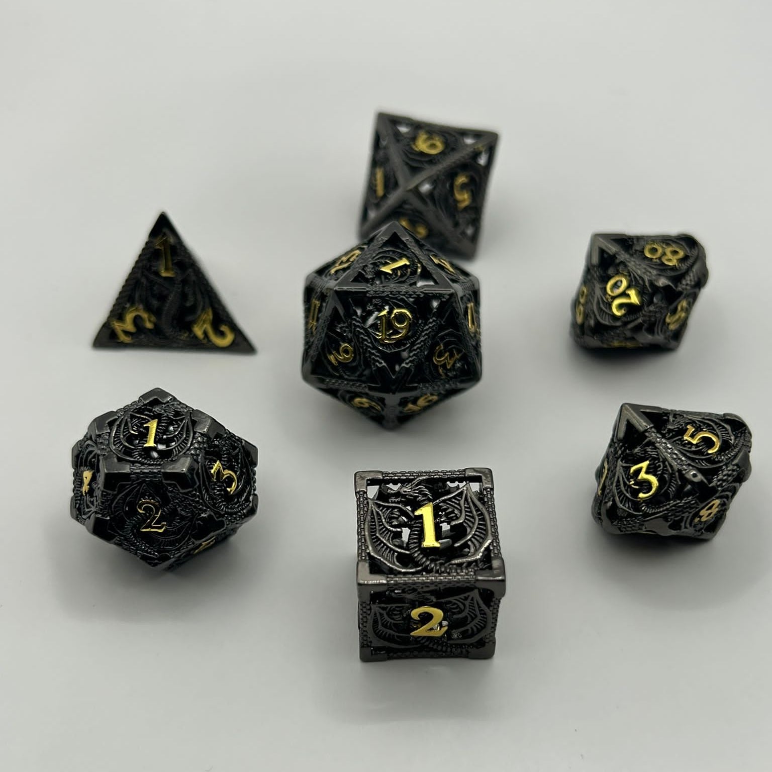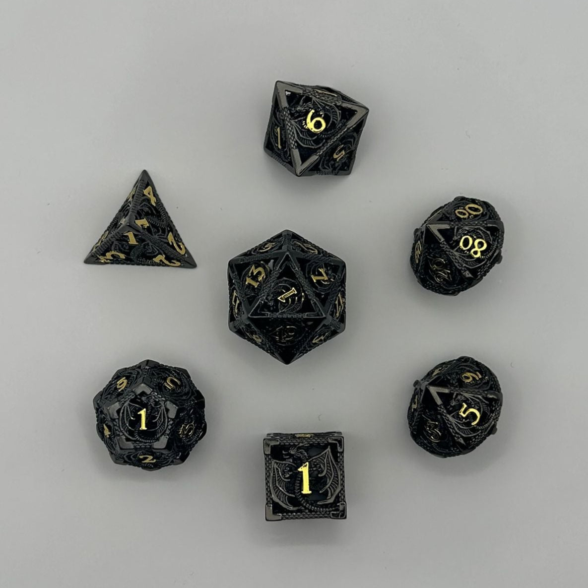 Schwarze Drachenflügel erstrahlen in goldenen Zahlen, die in diesem edlen Würfelset den Glanz alter Legenden widerspiegeln. Perfekt für Abenteuer voller Magie und Drachenmythen. Lasse das Schicksal durch die Flügel der Macht entscheiden!