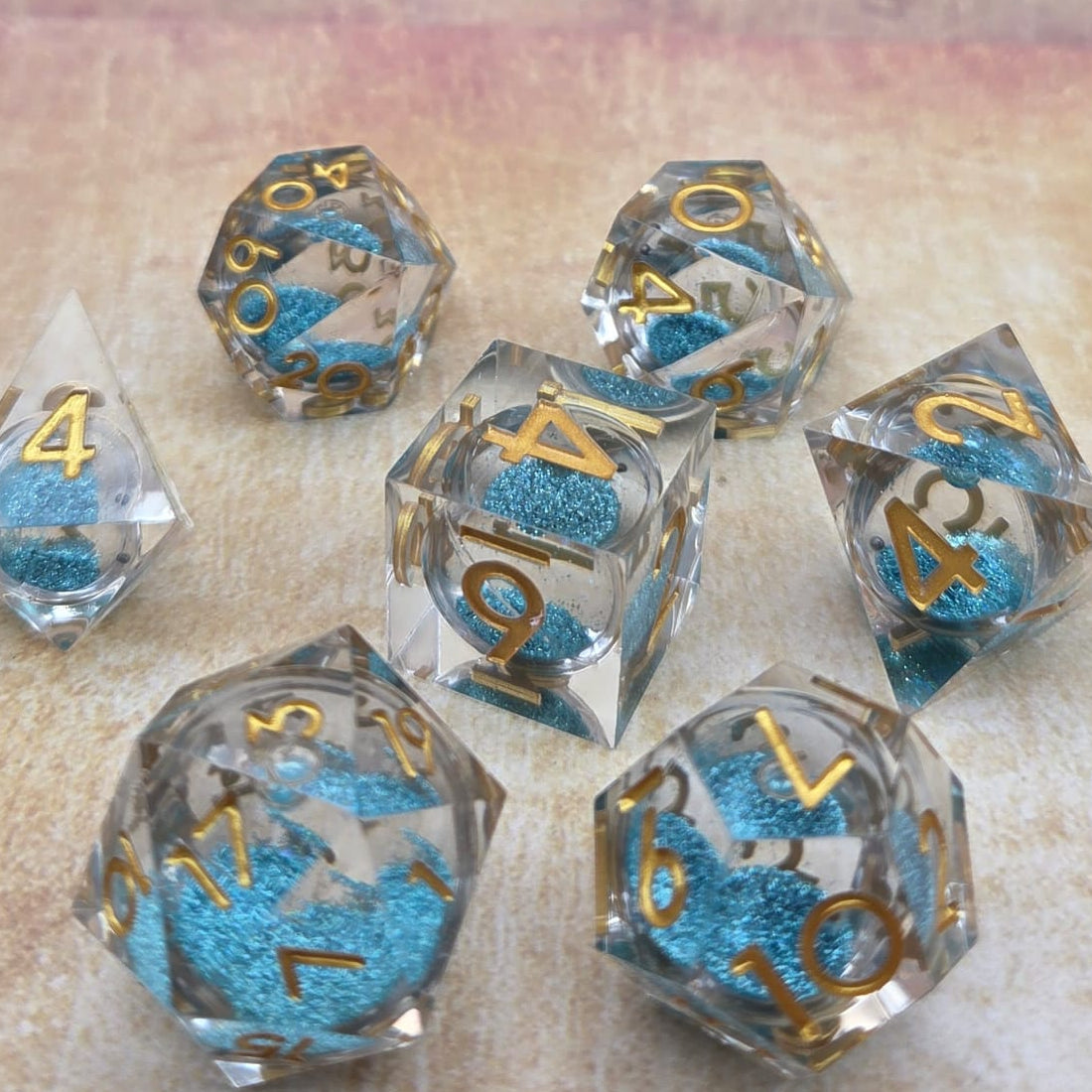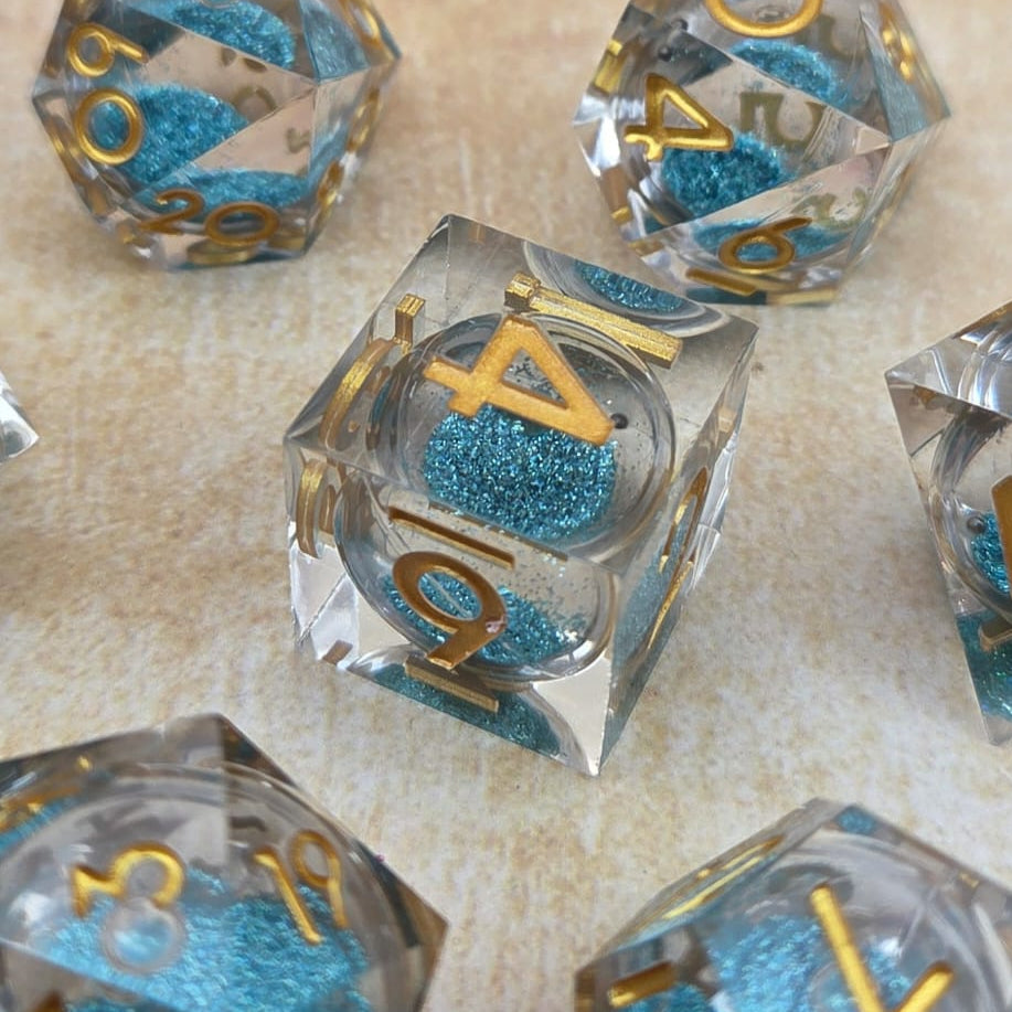 Dieses Würfelset verzaubert mit seiner klaren, transparenten Oberfläche, in deren Innerem feiner Glitzer tanzt wie Feenstaub im Mondschein. Bei jedem Wurf erwacht ein leises Schimmern – als hätten unsichtbare Flügel den Zauber selbst verstreut.