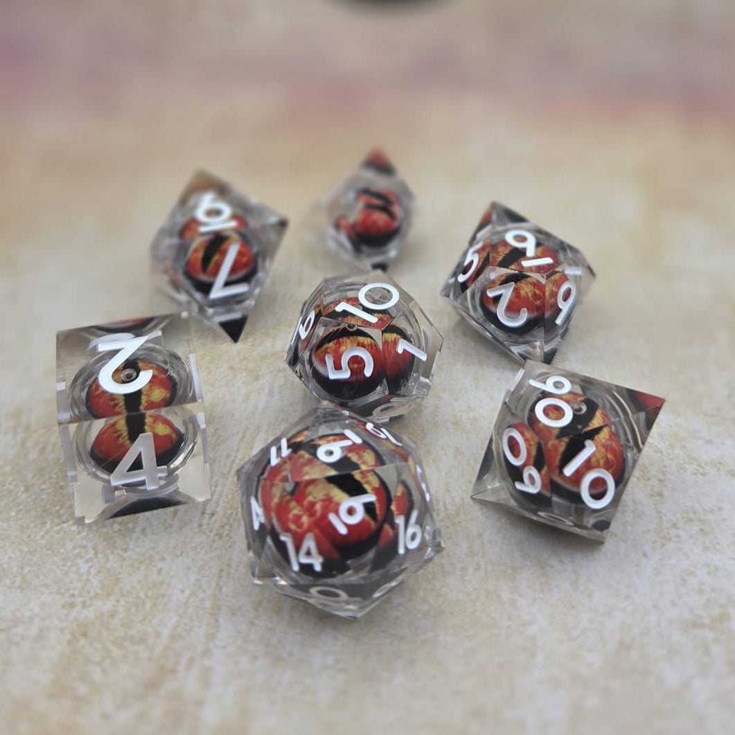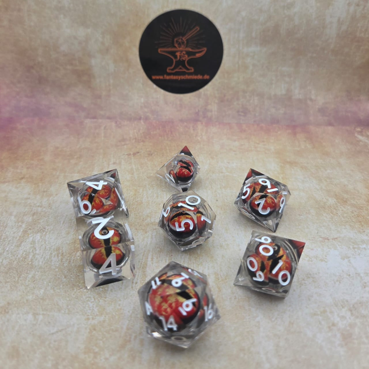 Entfache die Flammen der Macht mit dem Eye of Fire, einem Würfelset, das so fesselnd wie geheimnisvoll ist. Diese durchscheinenden Würfel, durchzogen von glühenden Rottönen, beherbergen ein feuriges Auge im Inneren – ein Symbol für unbändige Kraft und unnachgiebige Wachsamkeit.