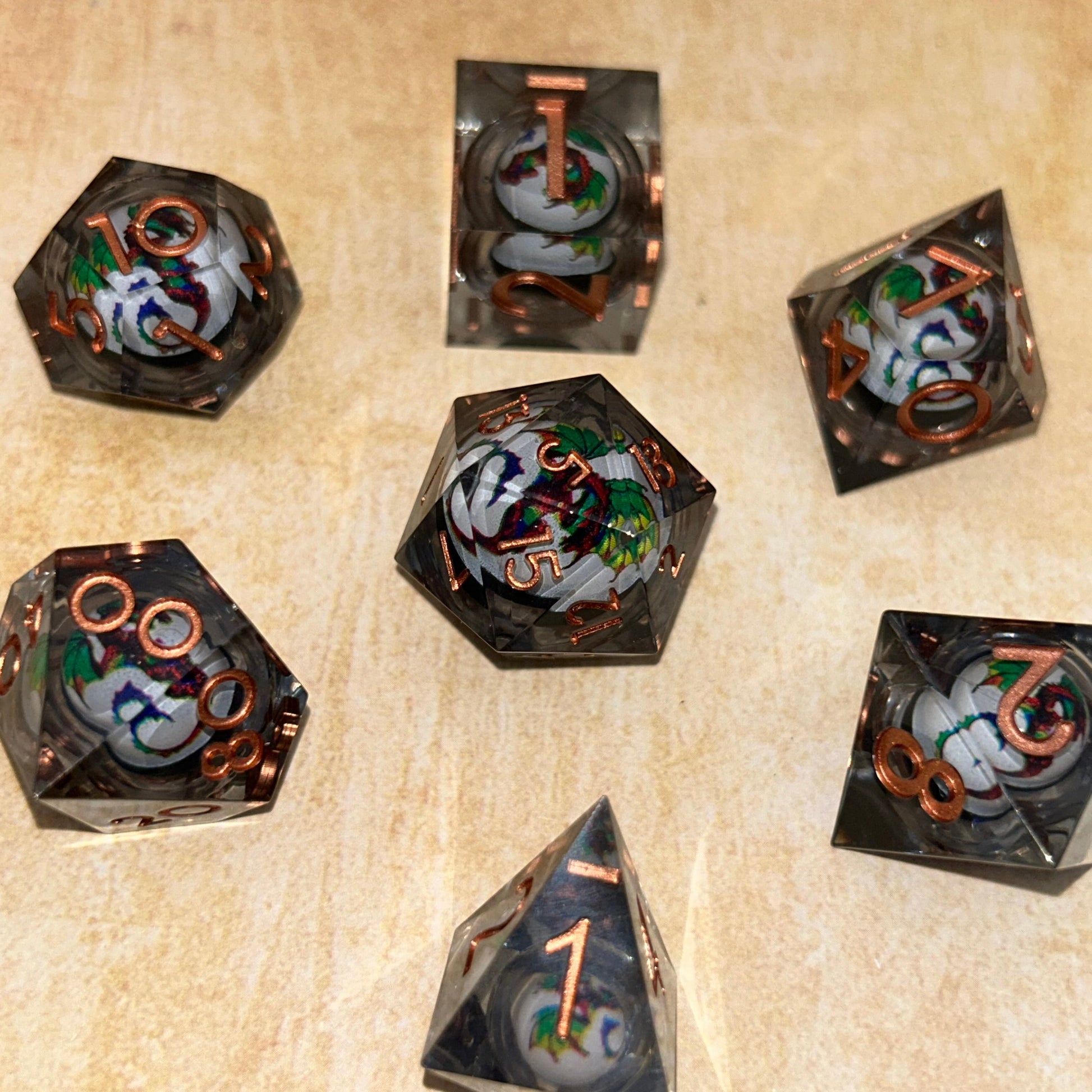 Tief im Herzen uralter Wälder, wo glühende Glut auf grünes Blattwerk trifft, wurde dieser Würfel geboren: Der Flammenlaub-Drache. Seine Schuppen aus Smaragd und Rubin verschlingen sich zu einem Spiel aus Feuer und Natur – eingefangen im Inneren eines einzigartigen Würfels.