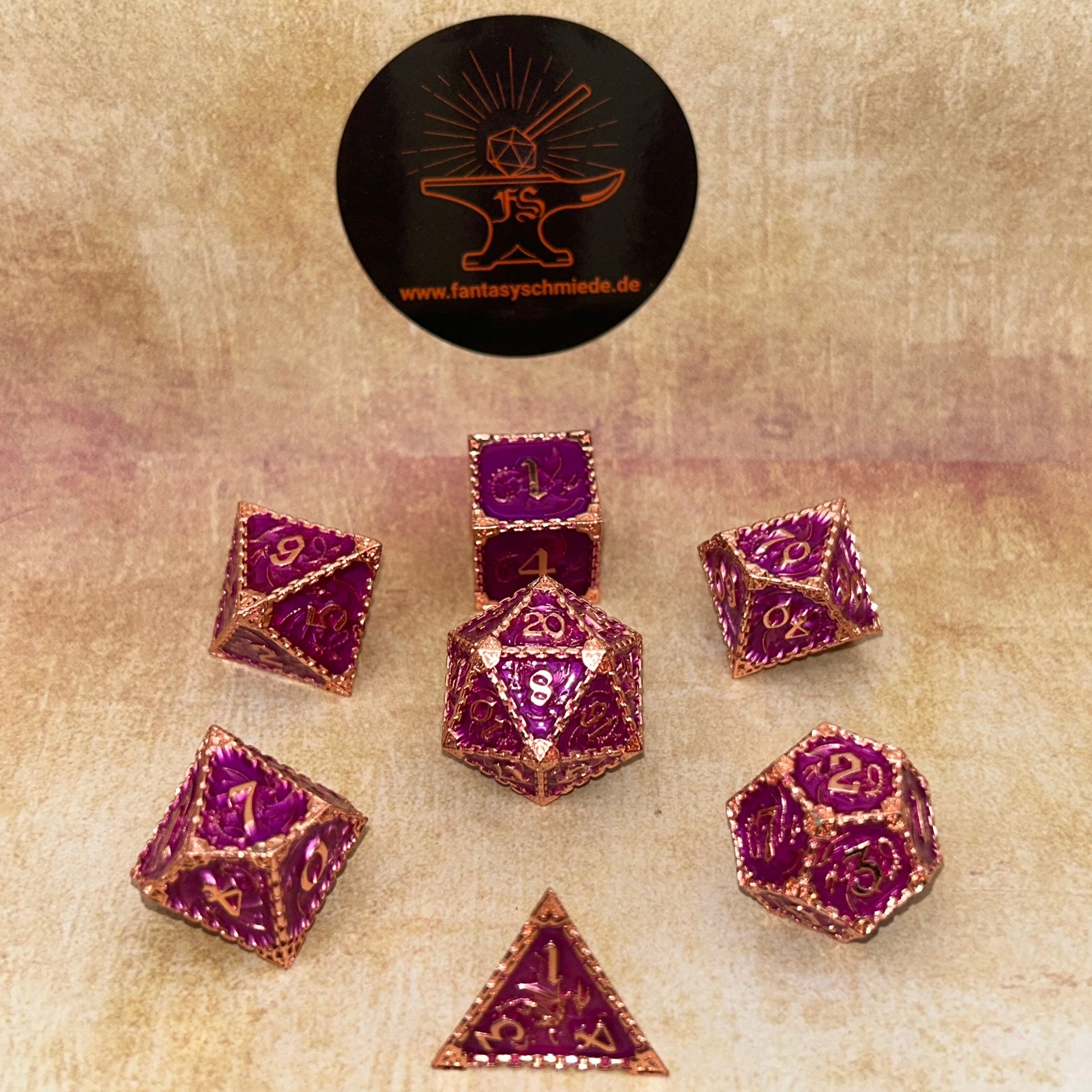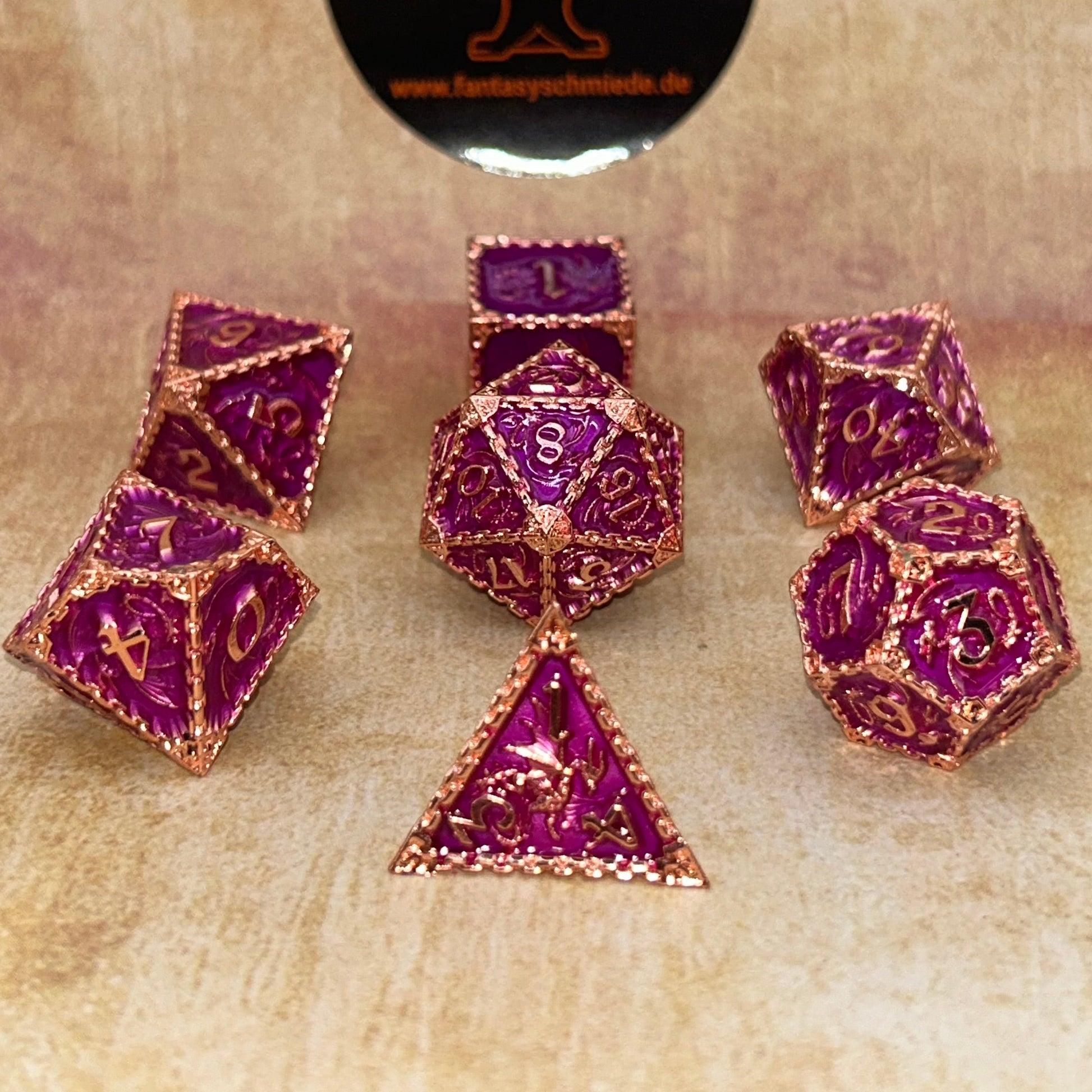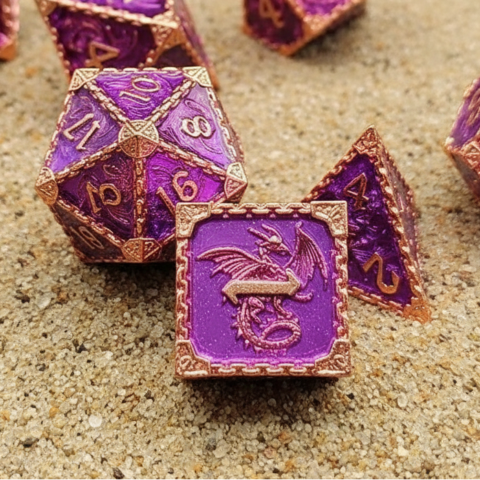 Lila und Gold vereinen sich zu einem majestätischen Glanz – ein Sinnbild für Stärke, Anmut und zeitlose Magie. Die fein gearbeiteten Schuppen und Linien erzählen von Drachen, deren Feuer einst Legenden formte. Jede Kurve zeugt von Handwerkskunst, jedes Detail von Hingabe.