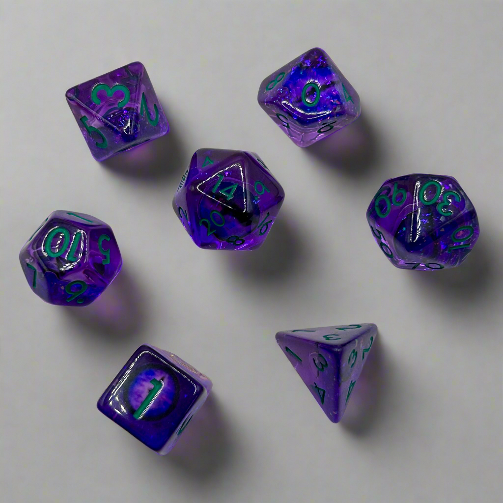 Dunkles Lila umhüllt diese Würfel wie die Schatten der Dämmerung. Sanft abgerundete Kanten lassen sie lautlos gleiten – als würde die Nacht selbst dein Schicksal lenke