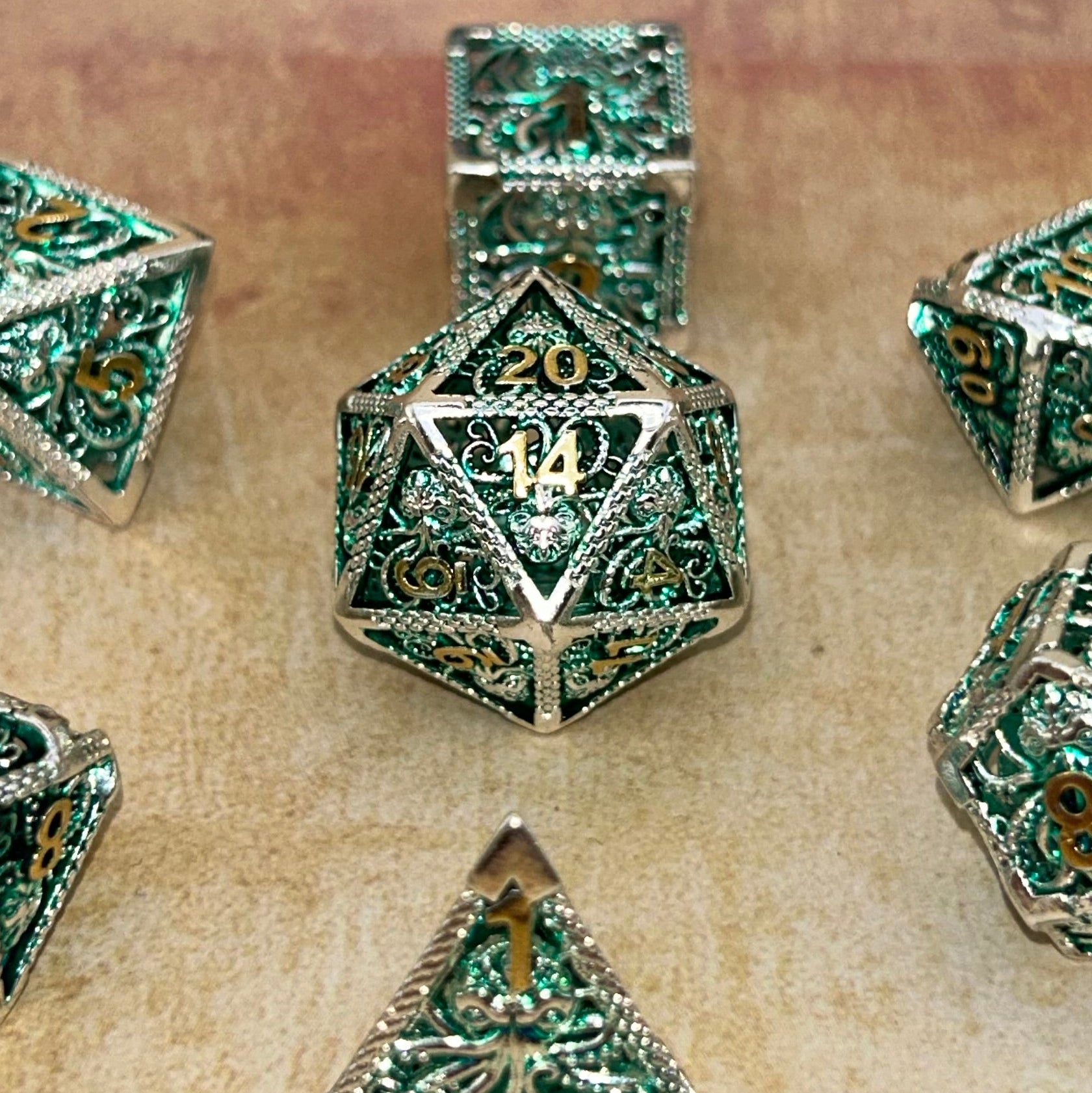 Kühles Silber vereint sich mit schimmerndem Grün – wie das Leuchten uralter Magie unter der Wasseroberfläche. Jeder Würfel scheint, als sei er aus dem Herz der Tiefe geschmiedet, wo Licht und Dunkelheit ineinanderfließen und Geheimnisse auf ihre Entdeckung warten.